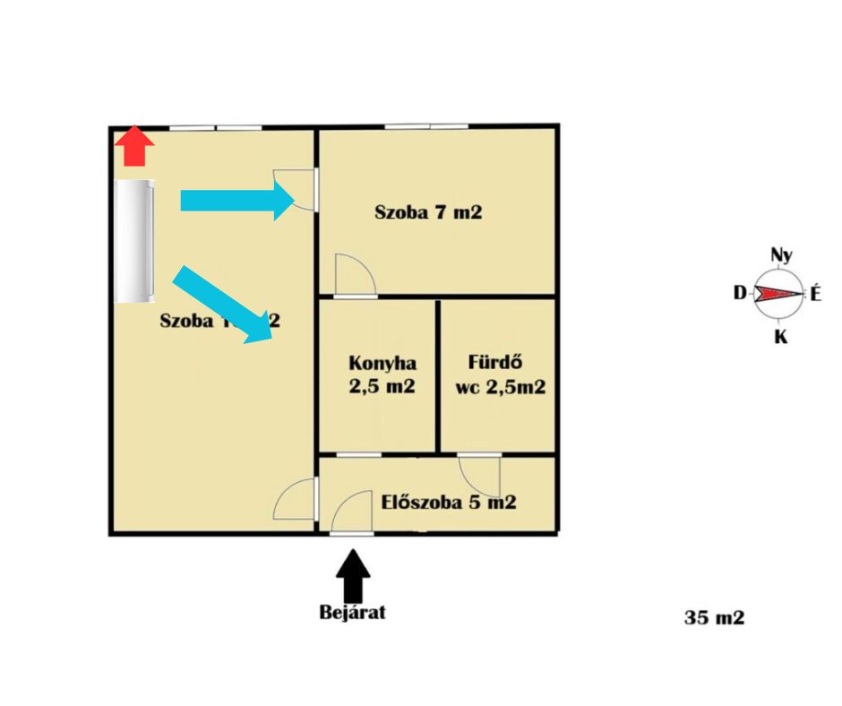 Az ábrán látható módon elhelyezett klíma az adott szoba hűtését teljes mértékben ki tudja szolgálni, illetve az egész lakásban indirekt módon is érezhető a berendezés hatása. Ez köszönhető a páratartalom csökkenésének és az áramló hideg, direkt légáramnak.