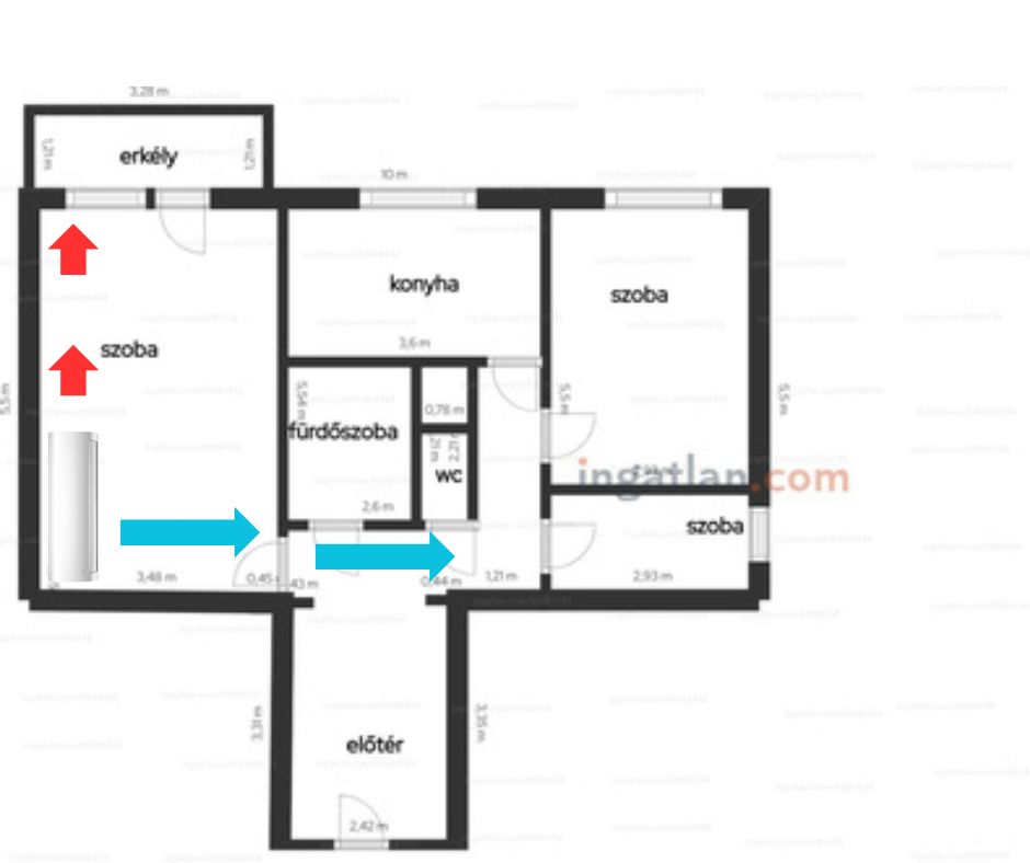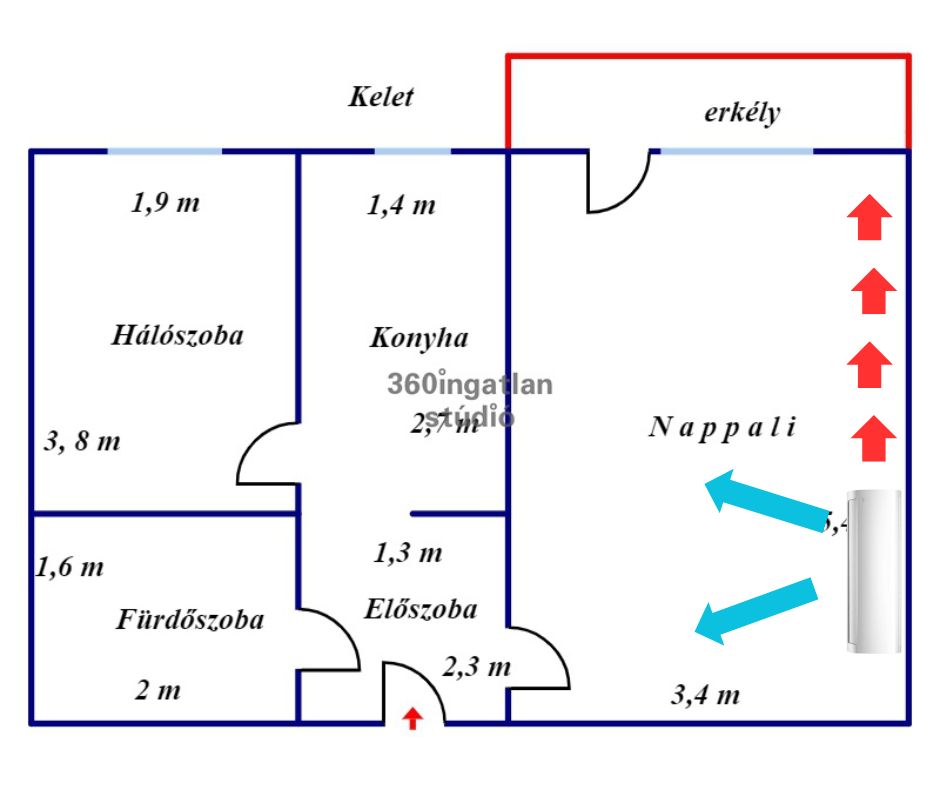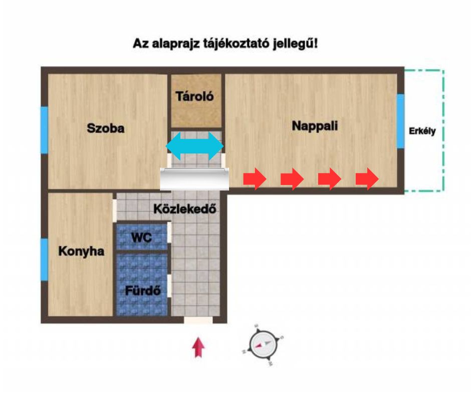 1. 2 szobás panellakás esetében a leggyakoribb felhasználói igény a nagy szoba falára elhelyezni a beltéri egységet a képen látható módon. A kültéri egységet ebben az esetben az erkélyen szoktuk elhelyezni. A piros nyíl jelöli a csövezés irányát, a kék nyíl pedig a légáramét.